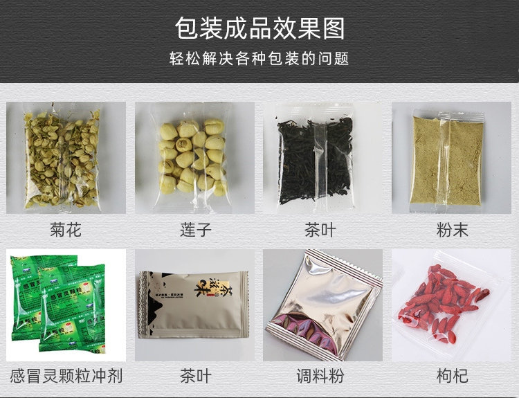 上海工廠生產(chǎn)的這款全自動(dòng)茶葉顆粒包裝機(jī)主要適用于包裝速溶咖啡、白糖顆粒、涼茶顆粒、小米、西米、種子、青豆、豆類(lèi)、五谷雜糧和食品顆粒等細(xì)小顆粒、圓形顆粒、小長(zhǎng)條狀顆粒等物品,0.2-1000克小劑量的自動(dòng)包裝,主要包裝材料為復(fù)合腹,無(wú)紡布,紙塑膜等材料,是在高溫下粘合的,包裝機(jī)能夠自動(dòng)的完成計(jì)量、充填、制袋、封合、切斷、記數(shù)、打印日期等功能。